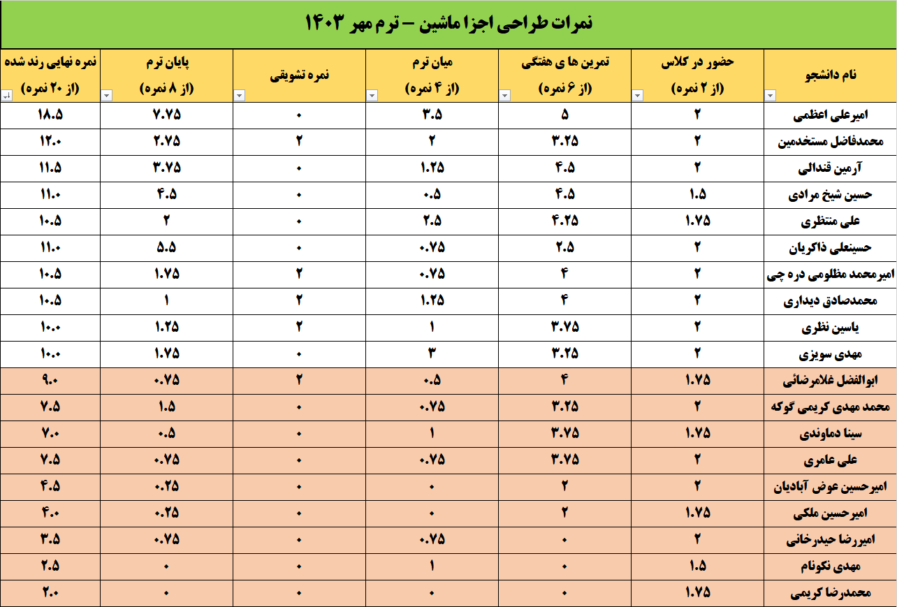 | امیرعلی اعظمی | ![]() | – | تحویل داده شد | تحویل داده شد | تحویل داده شد (۱/۲) | تحویل داده شد | تحویل داده شد | تحویل داده شد | تحویل داده شد | اعظمی: ۳٫۵ | تحویل داده شد | عدم تحویل | تحویل داده شد ۱/۲ | تحویل داده شد |